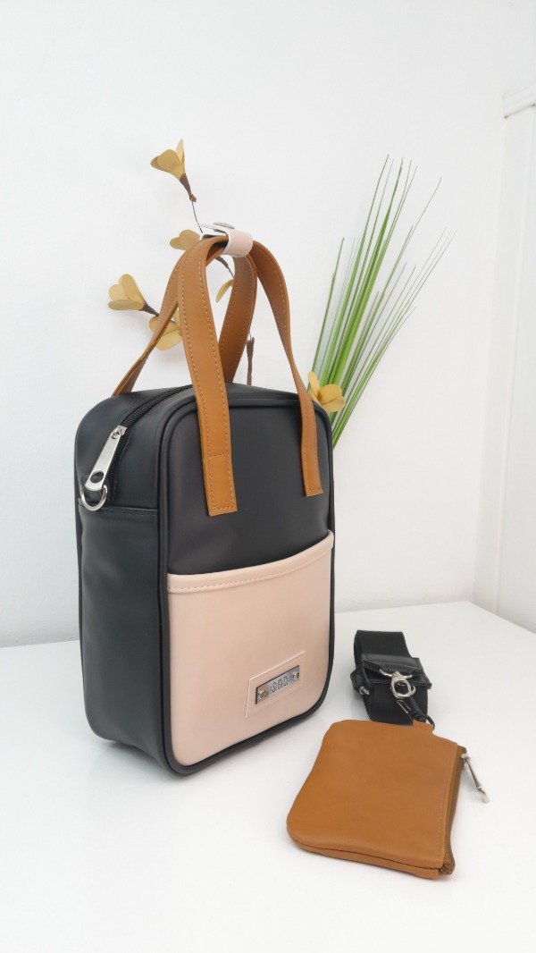 • MANIJAS CORTAS Y CORREA LARGA REGULABLE CON MOSQUETONES DE METAL.