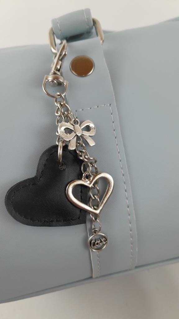 • CHARM - LLAVERO DESMONTABLE CON CORAZÓN DE ECO CUERO, VARIAS CADENAS Y DIJES DE METAL EN FORMA DE CORAZON, PALABRA LOVE Y PEQUEÑO MOÑO. SE PUEDE USAR CON o SIN ÉL.