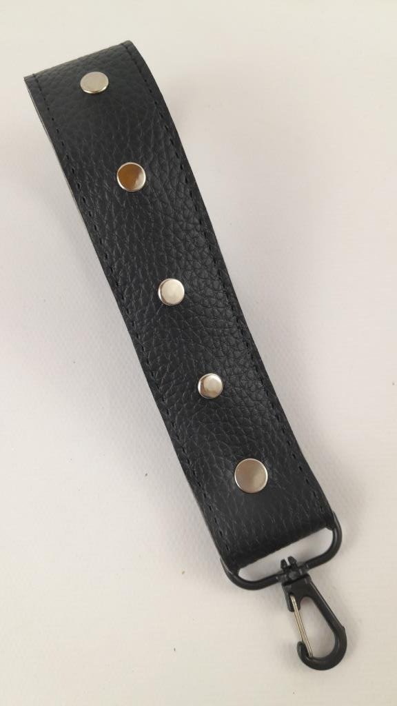 • MANIJA CON HILERAS DE APLIQUES DE METAL Y MOSQUETON QUE SE PUEDE DESMONTAR Y USAR COMO LLAVERO.